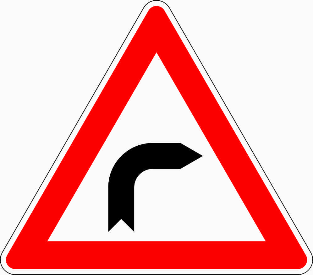 Verkehrszeichen 103-20 „Kurve rechts“: Mit diesem Zeichen wird vor einer gefährlichen Rechtskurve gewarnt, bei der eine große Richtungsänderung erfolgt und die schwer einsehbar ist. Richtungstafeln verdeutlichen, dass die Kurve unerwartet eng und unerwartet lang sein kann. Das Verkehrszeichen darf mit einer Geschwindigkeitsbegrenzung kombiniert werden.