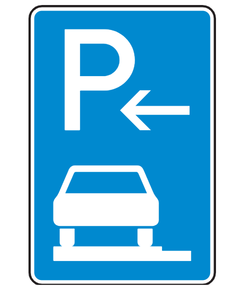 Verkehrszeichen 315-62 „Parken auf Gehwegen ganz in Fahrtrichtung links Ende“: Fahrzeuge unter 2,8 t dürfen mit dieser Beschilderung auf dem Gehweg parken. Das Zeichen gibt dabei vor, wie das Fahrzeug geparkt werden darf. Die Pfeile zeigen den Anfang und das Ende des Parkbereiches an. Die Parkerlaubnis kann mittels Zusatzzeichen beschränkt oder gebührenpflichtig sein.