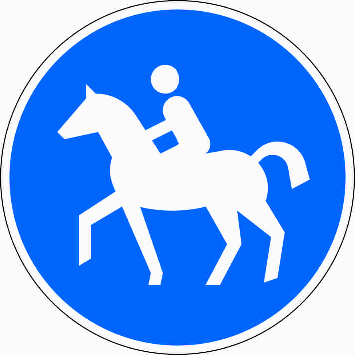 Verkehrszeichen 238 „Reitweg“: Diese gekennzeichneten Straßen und Wege sind nur von Reitern zu benutzen. Es gilt eine Reitwegbenutzungspflicht. Durch Zusatzzeichen kann eine weitere Verkehrsart erlaubt werden, die aber Rücksicht auf den Reitverkehr nehmen muss.