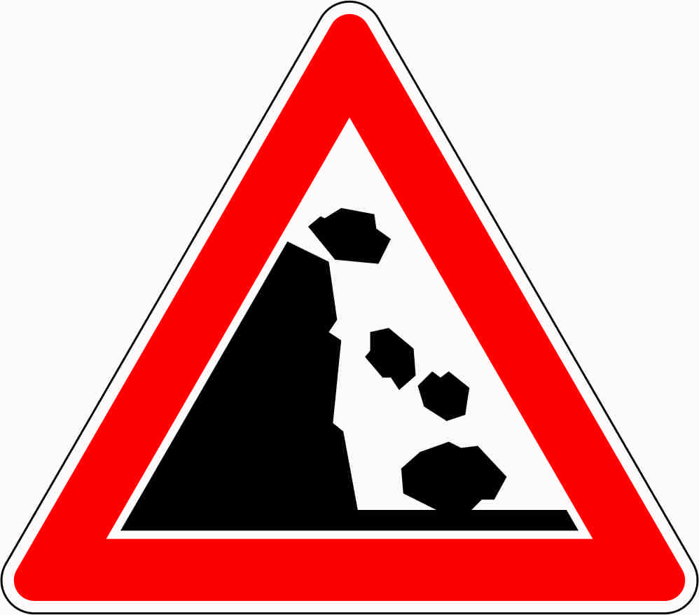 Verkehrszeichen 101-25 „Steinschlag, Aufstellung links“: Durch diesen Wegweiser wird vor herabfallenden und heruntergerollten Steinen linksseitig auf der Fahrbahn gewarnt. Die Gefahr kann aber auch von Steinen auf der Fahrbahn ausgehen. Fahrer werden darauf hingewiesen, dass die Geschwindigkeit angepasst und eine besonders vorsichtige Fahrweise nötig ist.
