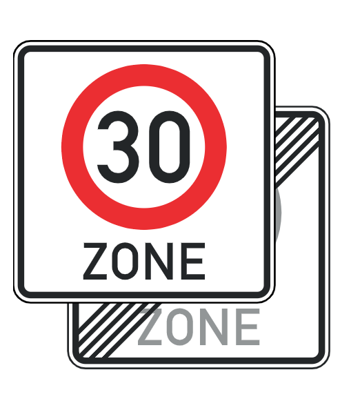 Verkehrszeichen 274.1-40 „Beginn einer Tempo 30- Zone doppelseitig“: Das Verkehrszeichen regelt den Beginn einer Höchstgeschwindigkeit von 30 km/h. Dies ist für alle Verkehrsteilnehmer gültig. Es wird häufig in der Nähe von Schulen, Kindergärten oder Altenheimen verwendet.Die doppelseitige Ausführung ist zur Anwendung empfohlen, dabei kennzeichnet das Zeichen 274.2 die Ausfahrt aus der Zone und damit die Aufhebung der Geschwindigkeitsbegrenzung.