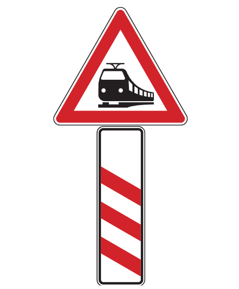 Verkehrszeichen 156-20 „Bahnübergang mit dreistreifiger Bake, Aufstellung links„: Der Bahnübergang wird durch Gefahrenzeichen (VZ 151) und einer dreistreifigen Bake angezeigt die Streifen der Baken zur Fahrbahnseite geneigt sind. Er befindet sich in 240 m Entfernung.
