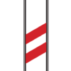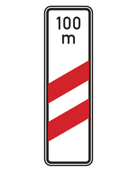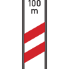 Verkehrszeichen 159-11 „Zweistreifige Bake mit Entfernungsangabe, Aufstellung rechts“: Der Bahnübergang wird durch eine zweistreifige Bake angezeigt, allerdings ist die Entfernungsangabe, auf Grund von örtlichen Gegebenheiten, verändert. Der Übergang befindet sich in 100 m Entfernung.